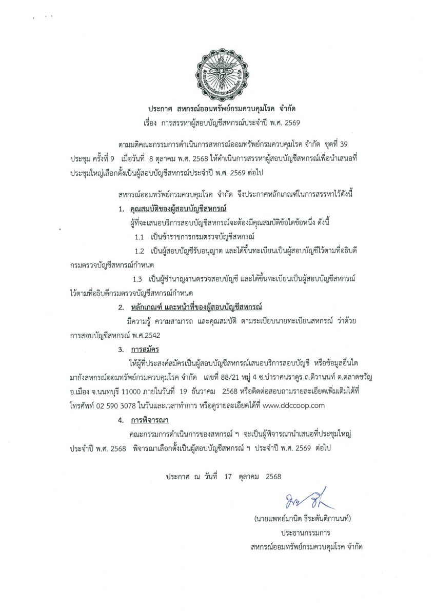 การสรรหาผู้สอบบัญชีสหกรณ์ประจำปี 2569