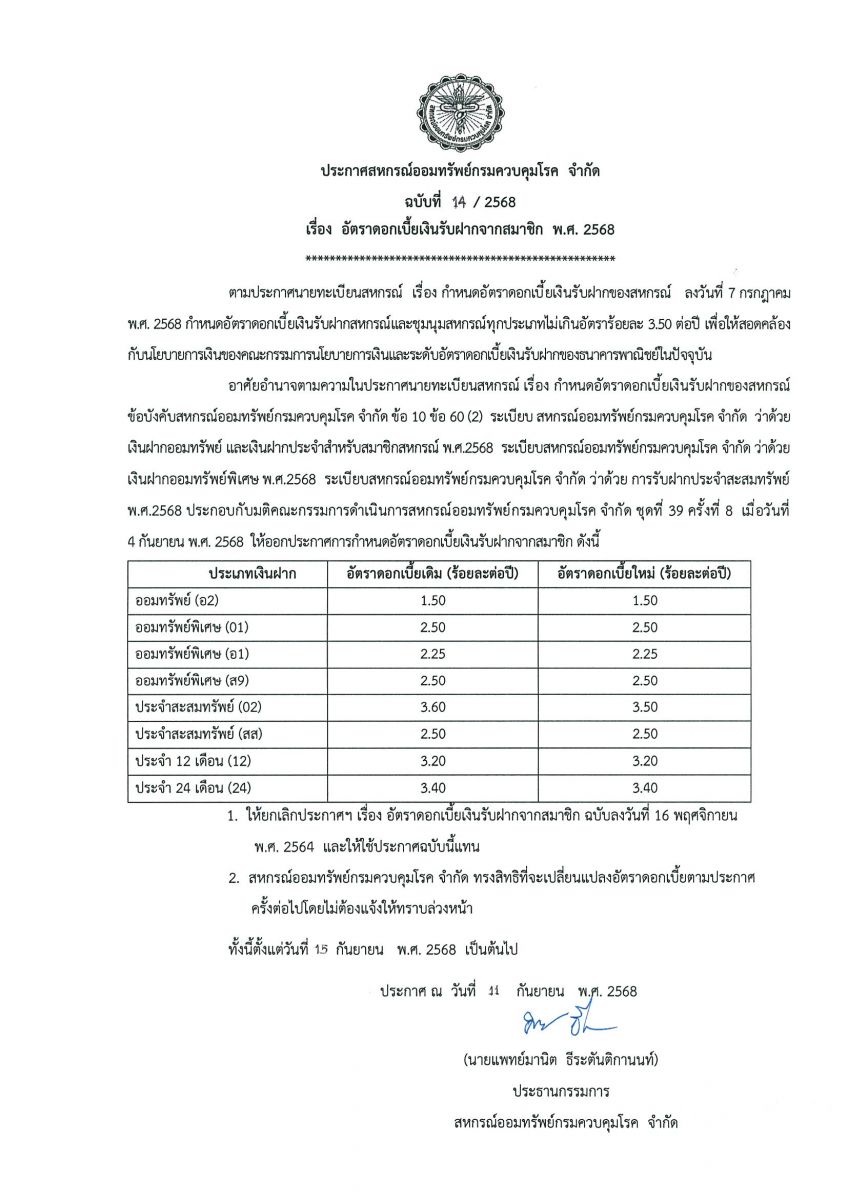 อัตราดอกเบี้ยเงินรับฝากจากสมาชิก พ.ศ. 2568